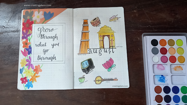 I kept my monthly spread fairly simple. I drew the calendar and coloured in green and orange in little circles to fill in the date. Since the theme is based on India and Independence Day, the colour scheme I’m going for this month is green and orange (based on the Indian flag).