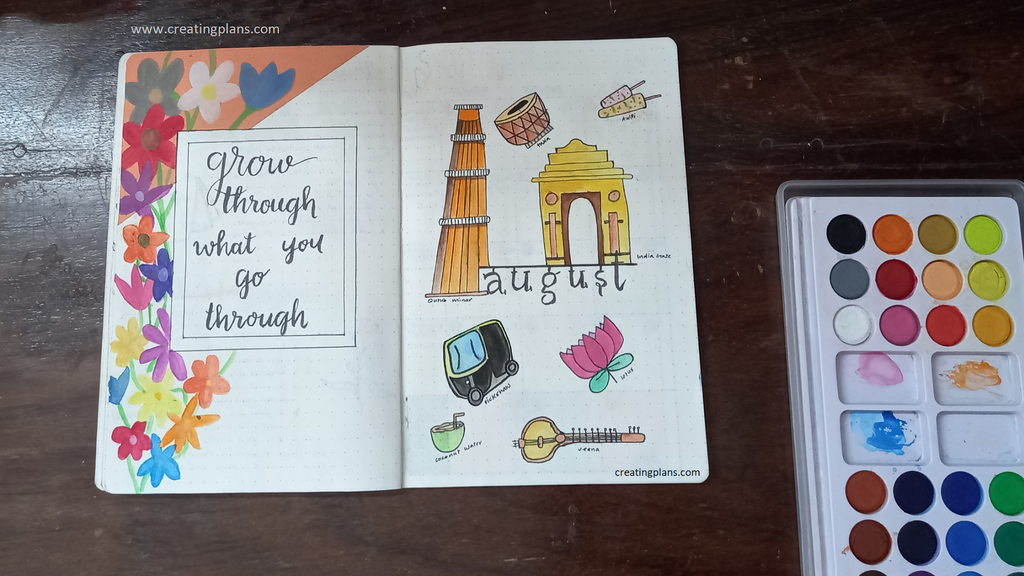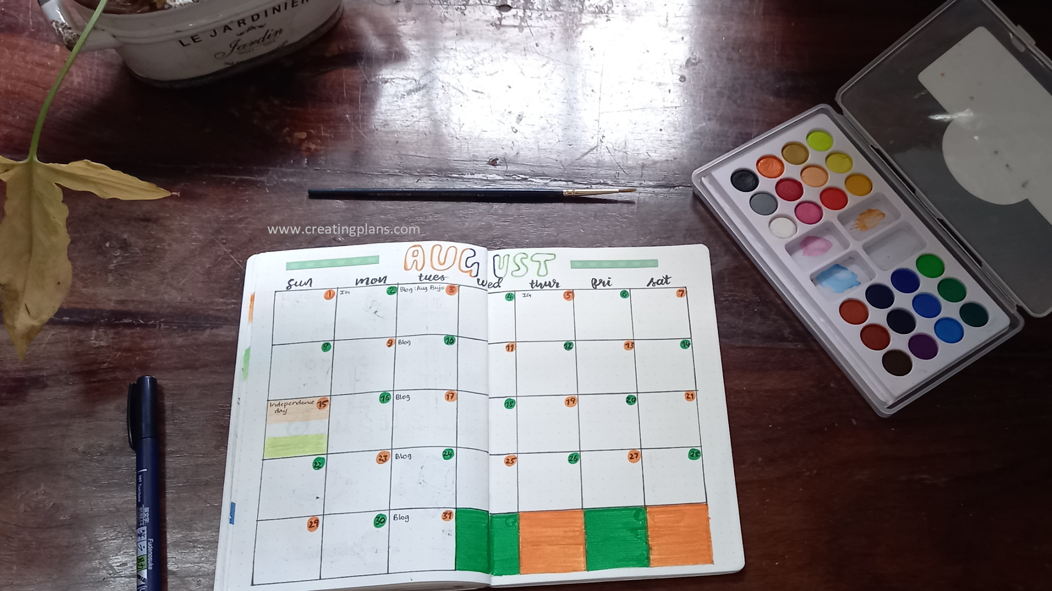 I kept my monthly spread fairly simple. I drew the calendar and coloured in green and orange in little circles to fill in the date. Since the theme is based on India and Independence Day, the colour scheme I’m going for this month is green and orange (based on the Indian flag).