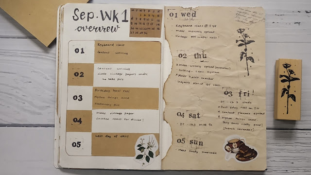 After this spread, I make my weekly spreads. I used my vintage washi tape, which I got from Washi Sabi’s Instagram shop and my DIY vintage paper to make the weekly spreads.
