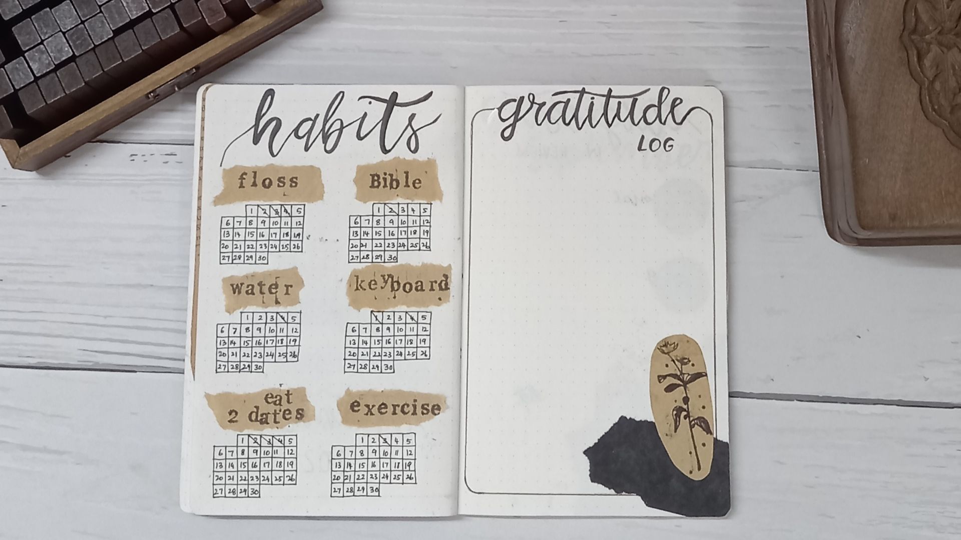 The habits I am tracking this month are reading the Bible, flossing, exercise, keyboard practice, drinking 2 bottles of water and eating 2 dates everyday. For this spread, I took some kraft paper and tore it into little bits and stamped in the headings using my alphabet stamps.