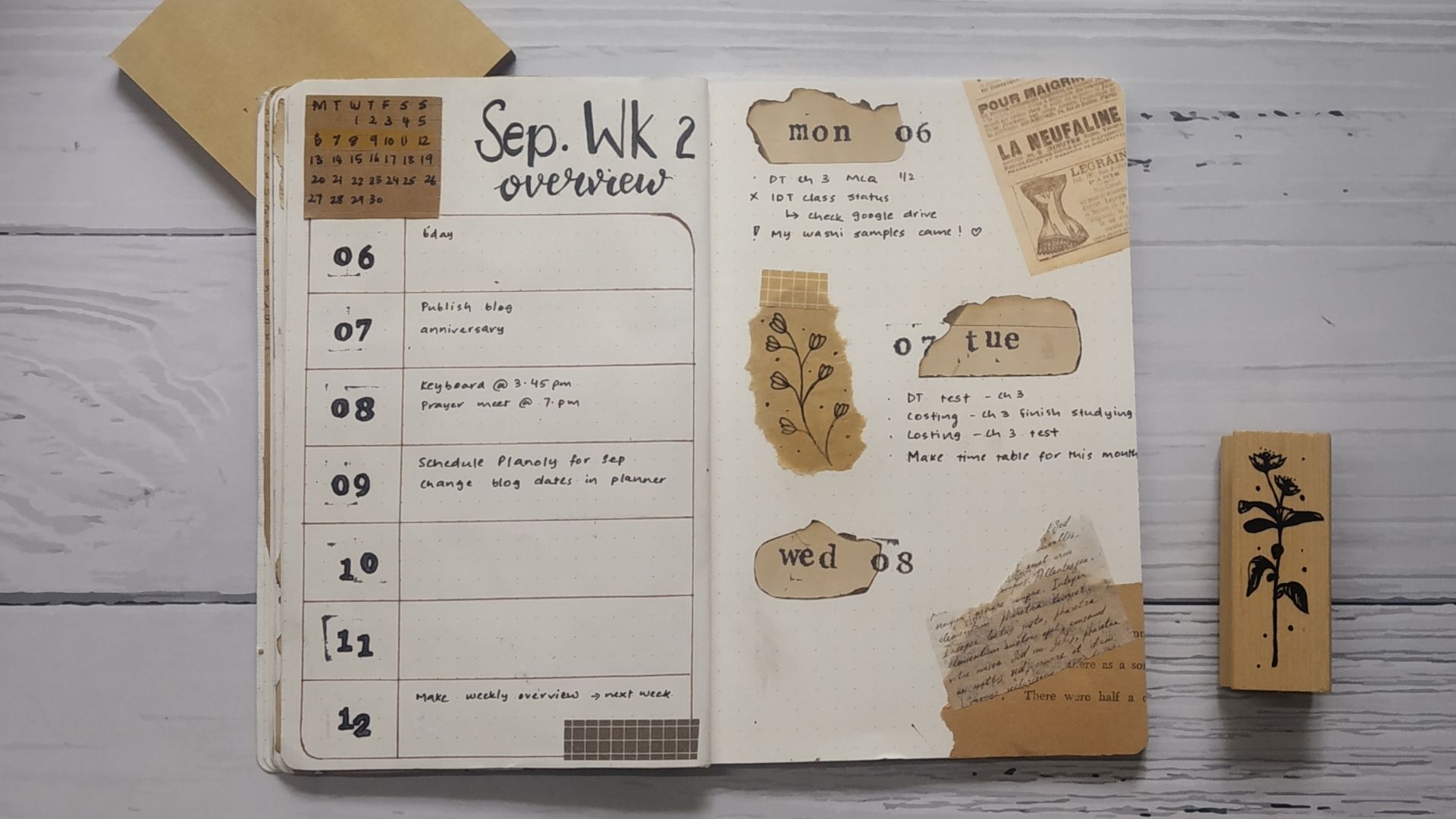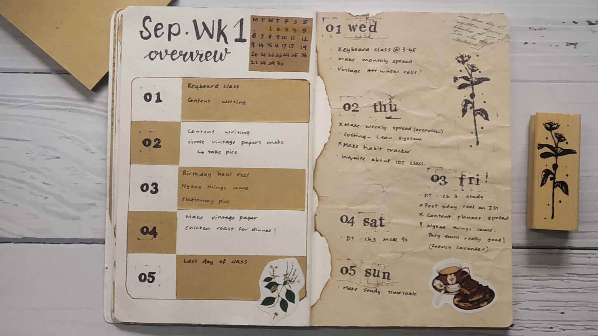 After this spread, I make my weekly spreads. I used my vintage washi tape, which I got from Washi Sabi’s Instagram shop and my DIY vintage paper to make the weekly spreads.
