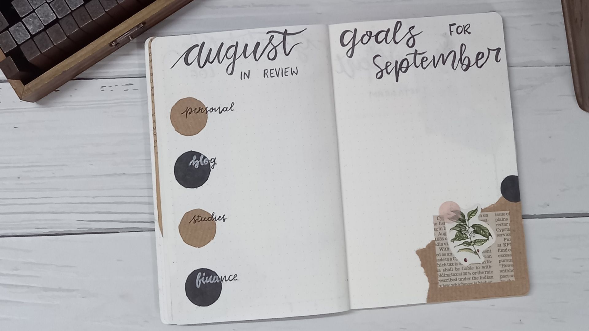 For the goals page, I again went with a layering style. For the first layer, a torn bit of kraft paper, next an old newspaper, and then, a plant sticker, which is from my coffee sticker set.