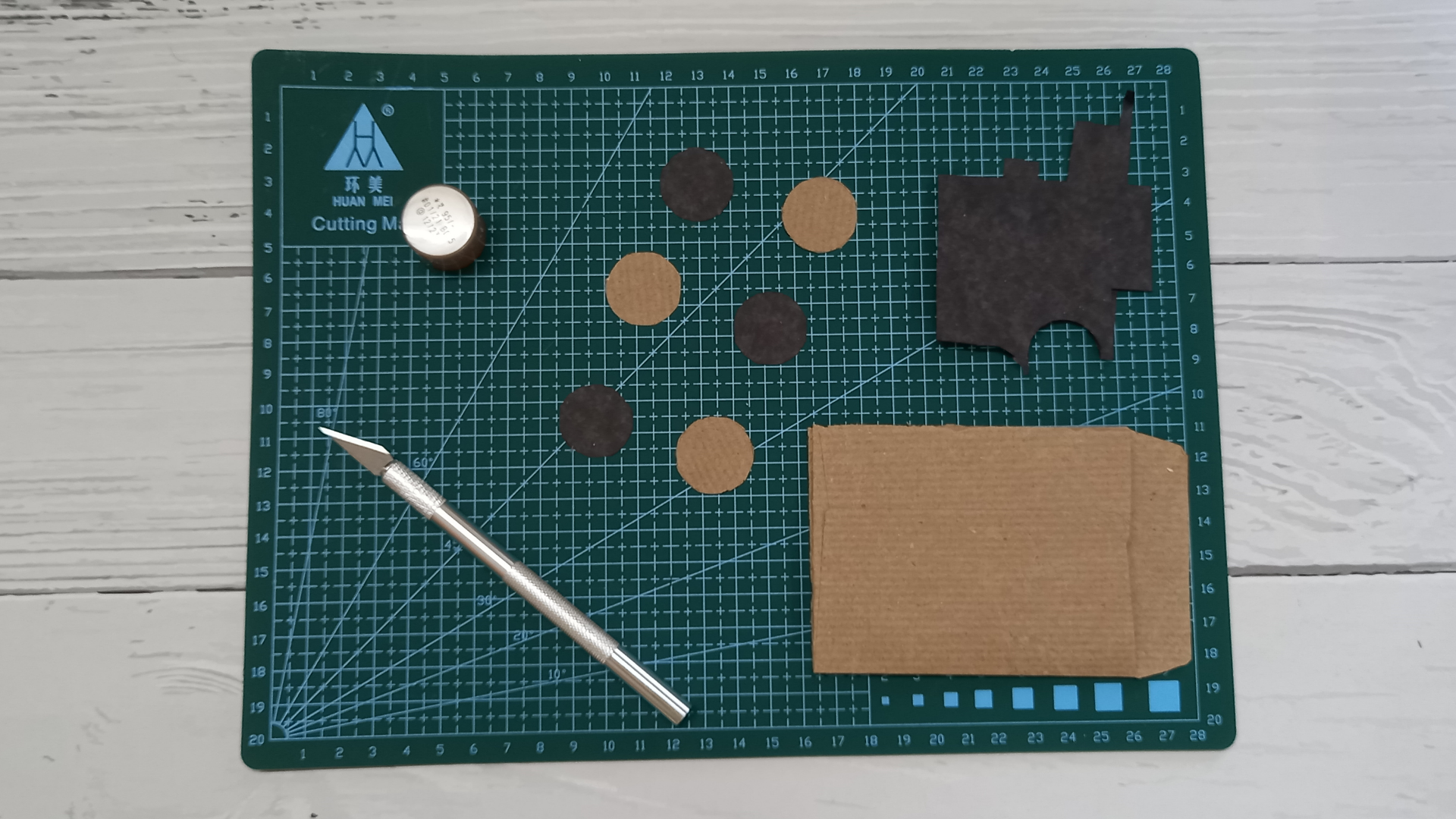 An exacto knife, a cutting board and kraft paper or scrap paper in the colour you want. I took a bit of black scrap paper I had and a brown envelope, which had been discarded.